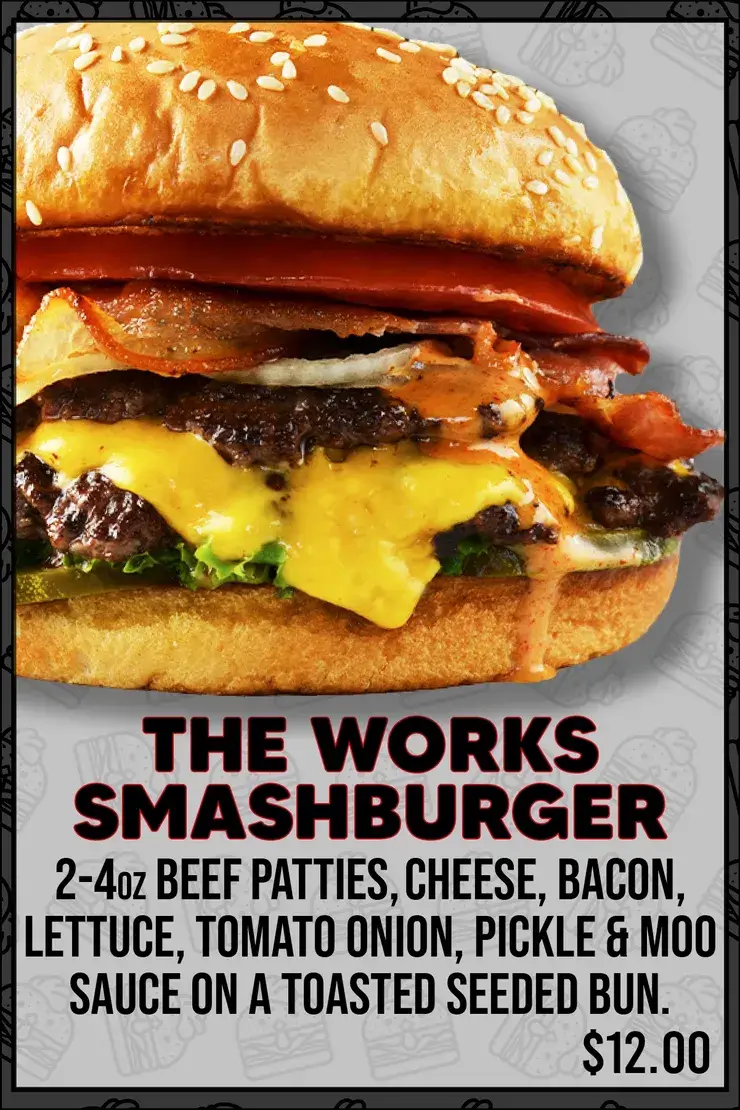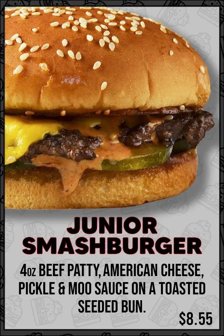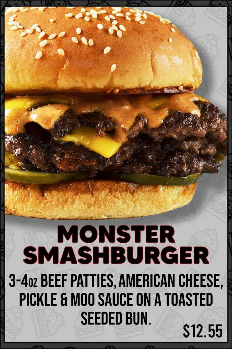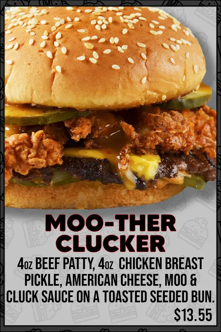 4oz beef patty and a 4oz chicken breast layered with pickle, American cheese, and Moo & Cluck sauce, served on a toasted seeded bun.