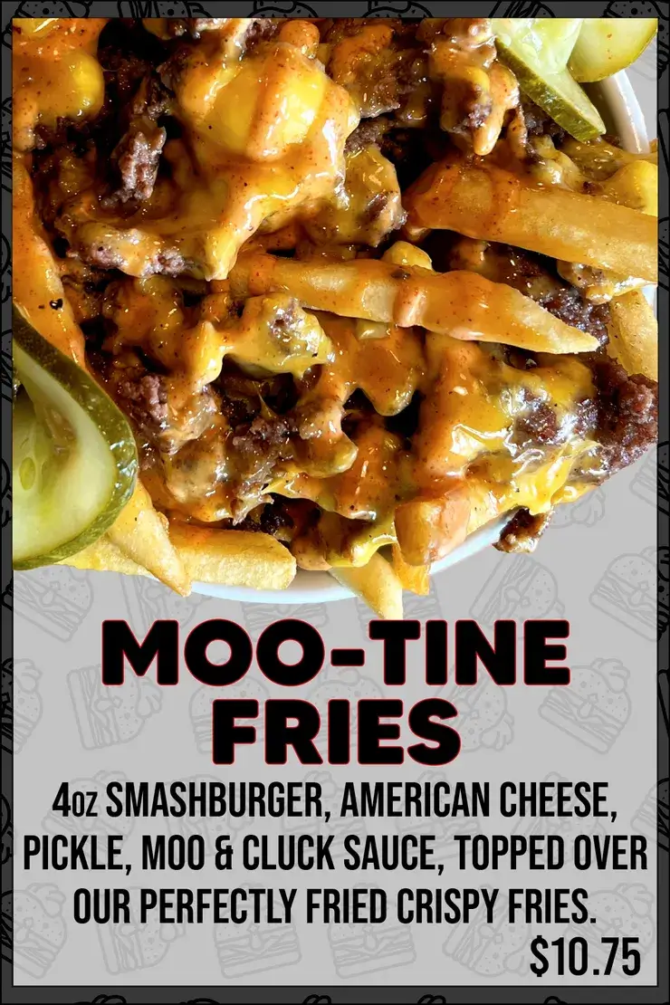 From the famous Moo-ther Clucker Sandwich, stacked with a juicy beef patty and seasoned chicken breast on a toasted seeded bun, to our mouthwatering Moo-Tine Fries topped with rich gravy and cheese, every item is crafted to satisfy serious comfort-food cravings. Whether youâre ordering takeout, grabbing a quick lunch, or visiting with family and friends, Cluck Cluck Moo Moo delivers consistent quality, big flavors, and a fun, unforgettable food experience. Stop by today and see why our smashburgers and hot chicken have become a must-try in Western New York.